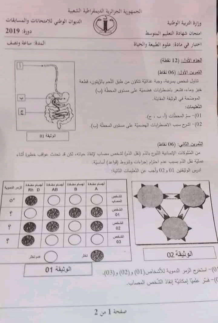 اختبار العلوم الطبيعية لشهادة التعليم المتوسط 2019 مع التصحيح