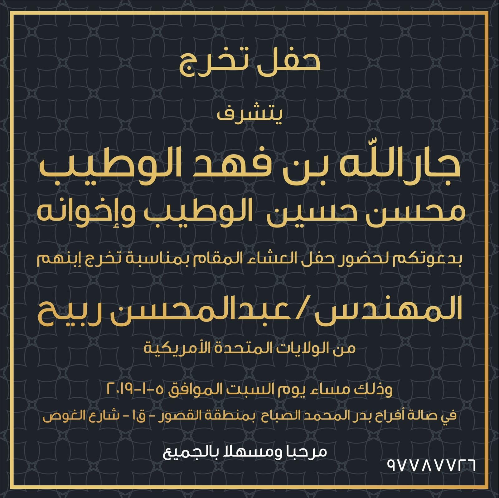 د عبدالله حسين الوطيب على تويتر نتشرف بدعوتكم لحضور حفل تخرج ابن اخي المهندس عبدالمحسن الوطيب مساء السبت ٢٠١٩ ١ ٥ فأهلا وسهلا بالجميع